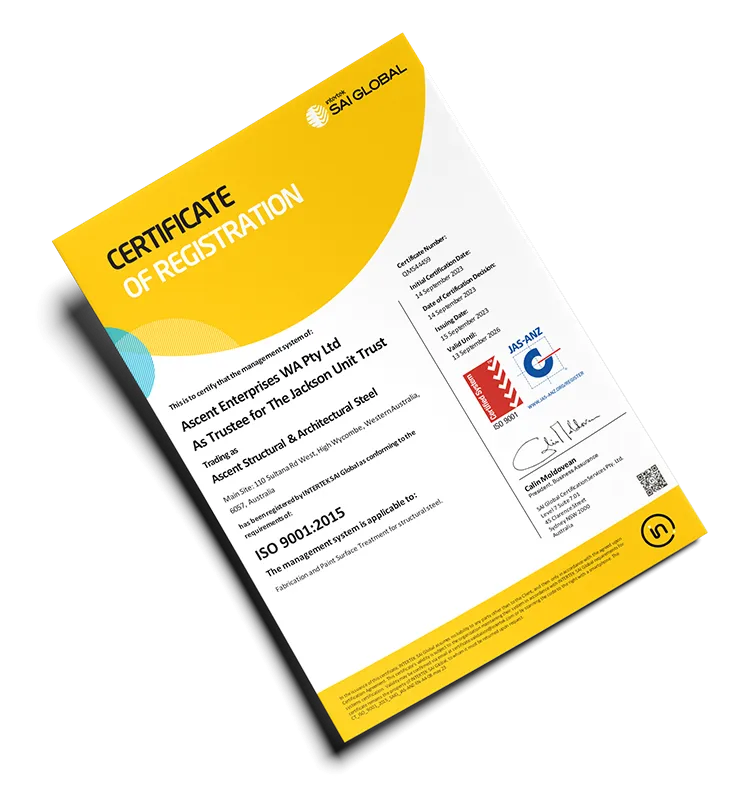 We hold ISO 9001 Quality Management System certification, underscoring our commitment to operational excellence and consistent quality. Additionally, we have proudly achieved Construction Category CC3 Compliance through Steel Compliance Australia (SCA) for our structural steel fabrication and surface treatment facilities.